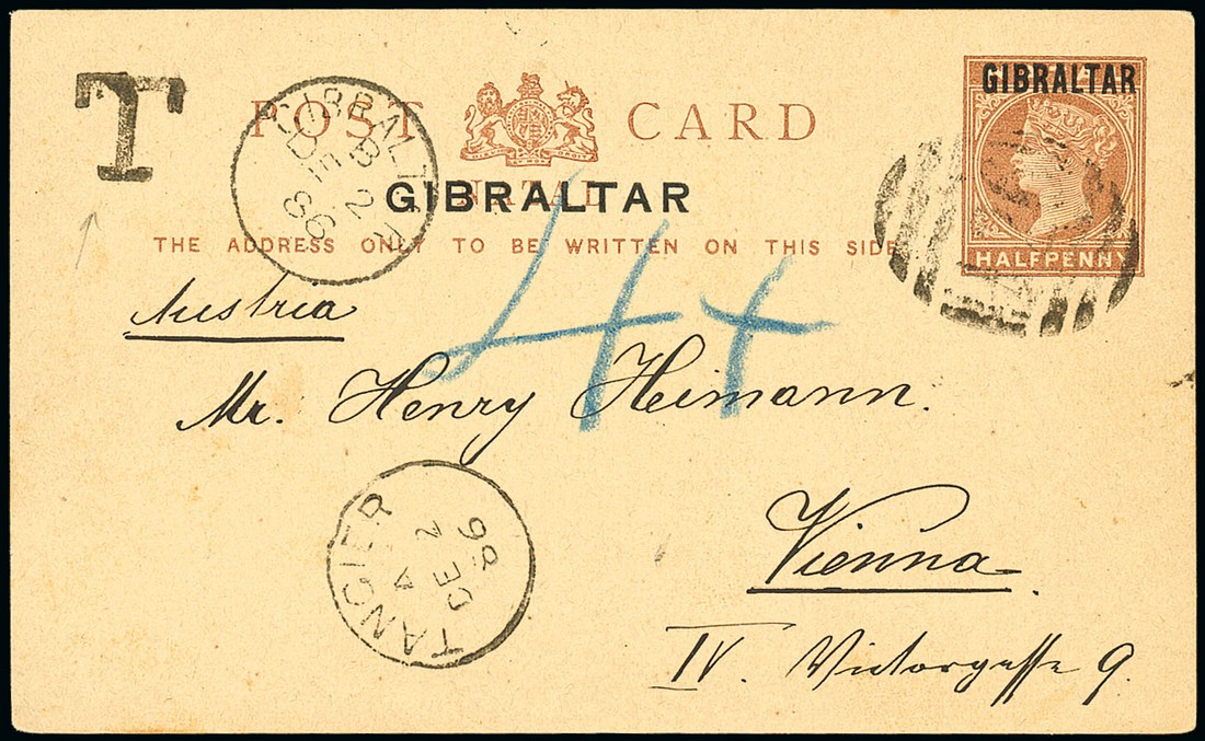 1886 (2 Dec.) Gibraltar overprint ½d. brown card to Vienna, cancelled "A26" and showing "T" handstamp at upper left corner, Tangier and Gibraltar (2.12) c.d.s. and manuscript "4+" (gold centimes) charge mark in blue crayon; one of only five such cards recorded used. Photo