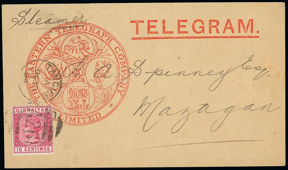 1894 (30 Oct.) Eastern Telegraph Company Limited printed "telegram." envelope to Mazagan, marked "Steamer" and bearing 1889-96 10c. carmine tied by "A26" duplex, arrival c.d.s. (date unclear) on reverse. Rare and most attractive. B.P.A. Certificate (2012). Photo