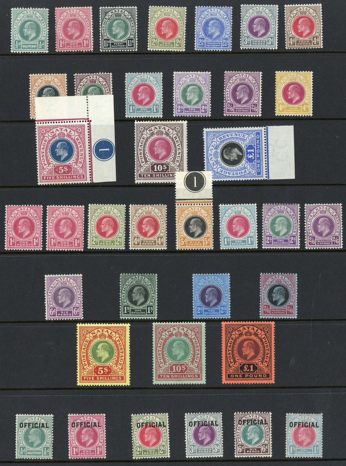 1902-03 CA ½d. to 4/-, 1902 CC 5/- (corner example with plate number), 10/- and £1, 1904-08 MCA 1d. (both) to 2/6d., 1908-09 6d. to £1 and Official Stamps 1904 ½d. to 1/-