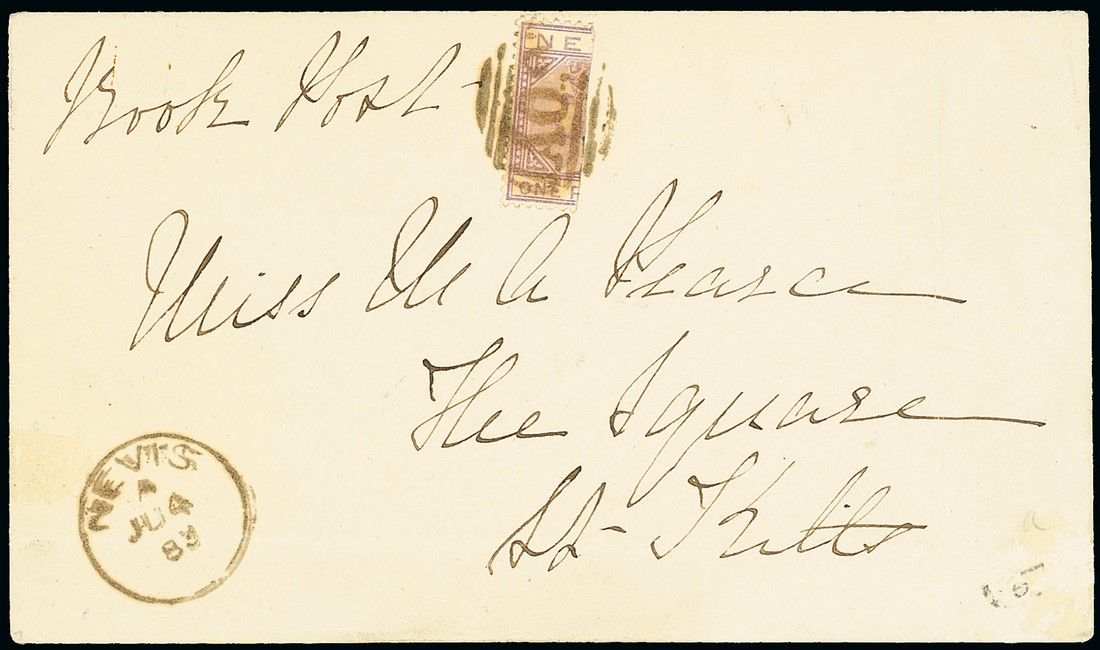 1883 (4 June) envelope to St. Kitts, marked "Book Post", bearing 1882 CA 1d. lilac-mauve bisected vertically and tied by "A09" obliterator with Nevis c.d.s. at lower left. S.G. 26a, £700. Photo