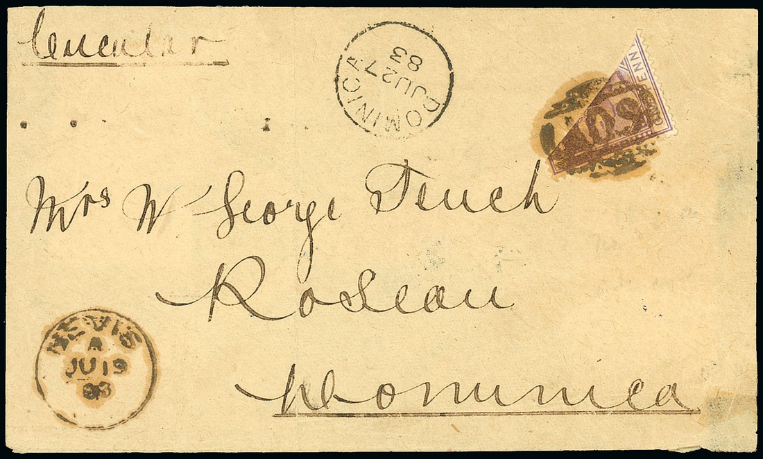 1883 (19 June) envelope to Dominica, marked "Circular", bearing 1882 CA 1d. lilac-mauve bisected diagonally" tied by slightly oily "A09" obliterator and showing despatch and arrival datestamps; the envelope with vertical crease towards left. S.G. 26a, £700. Photo