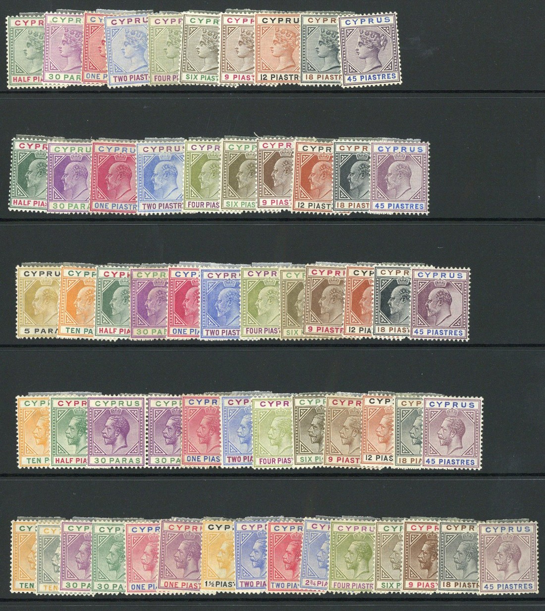 1894-96 ½pi. to 45pi., 1902-04 CA ½pi. to 45pi., 1904-10 MCA 5pa. to 45pi., 1912-15 MCA 10pa. to 45pi. and 1921-23 Script 10pa. to 45pi., fine mounted mint. S.G. 50-99, £2,000
