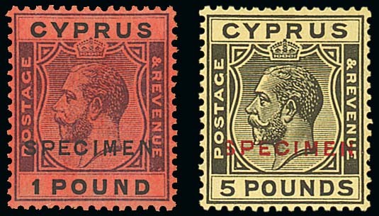 £1 purple and black on red and £5 black on yellow, both overprinted "specimen" (D16), fine mint. S.G. 102s and 117as, £1,000+. Photo