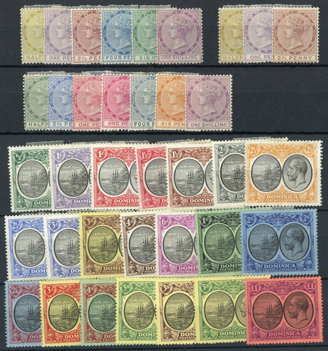 1877-79 CC ½d. to 1/-, 1883-86 CA ½d. to 2½d., 1886-90 CA ½d. to 1/- with additional 1d. shade, 1923-33 ½d. to £1 set of twenty one; large part original gum, a few minor imperfections, otherwise fresh and fine. S.G. between 4 and 91, £1,483.
