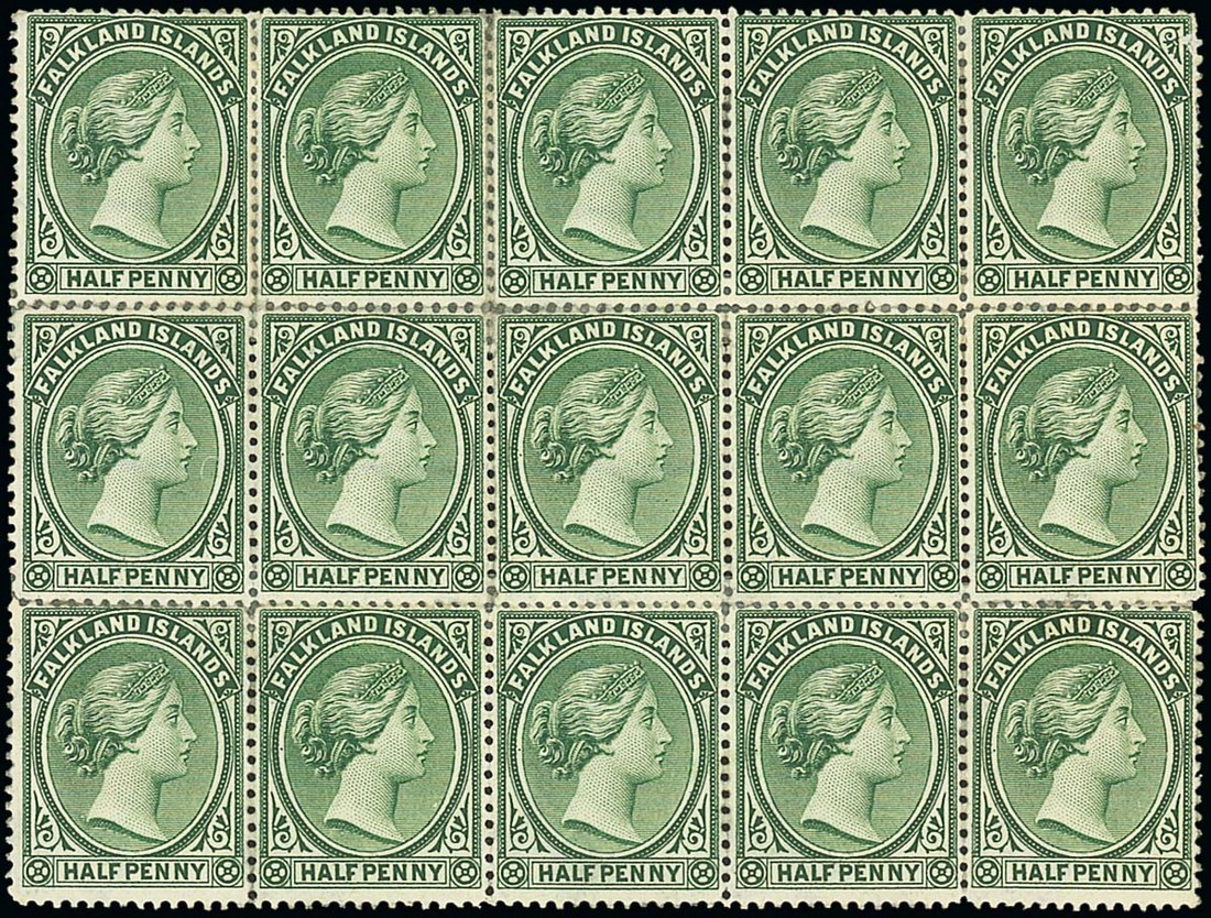 1891-1902 ½d. green block of fifteen (5x3), variety watermark reversed, large part original gum, reinforced perfs, nevertheless a rare block. S.G. 16ax. Photo
