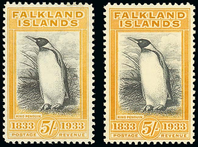 — 5/- black and yellow (a few thinned perfs at top) and 5/- black and yellow-orange; large part original gum, fresh and fine. B.P.A. Certificate (1995) for latter. S.G. 136, 136a, £3,650. Photo