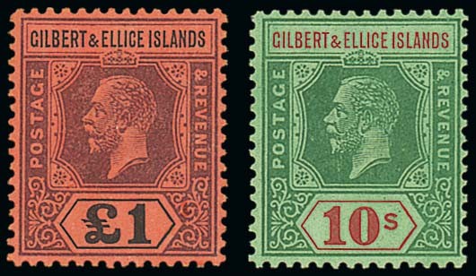 — £1 purple and black on red and 1924 10/- green and red on emerald (2); fine mint. S.G. 24, 35, £870. Photo