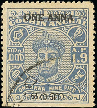 1949 "one anna" on 1a.9p. ultramarine, used, variety surcharge in black, straight-edge at foot, very minor crease, otherwise fine. A rare stamp. B.P.A. Certificate (2006). S.G. 123a, £4,500. Photo
