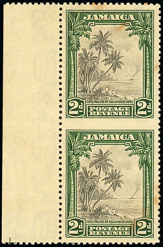 1932 2d. black and green marginal vertical pair from the left of the sheet, variety imperforate between, large part original gum, gum toning with some stains apparent on front, otherwise fine. Very rare. S.G. 111a, £14,000. Photo