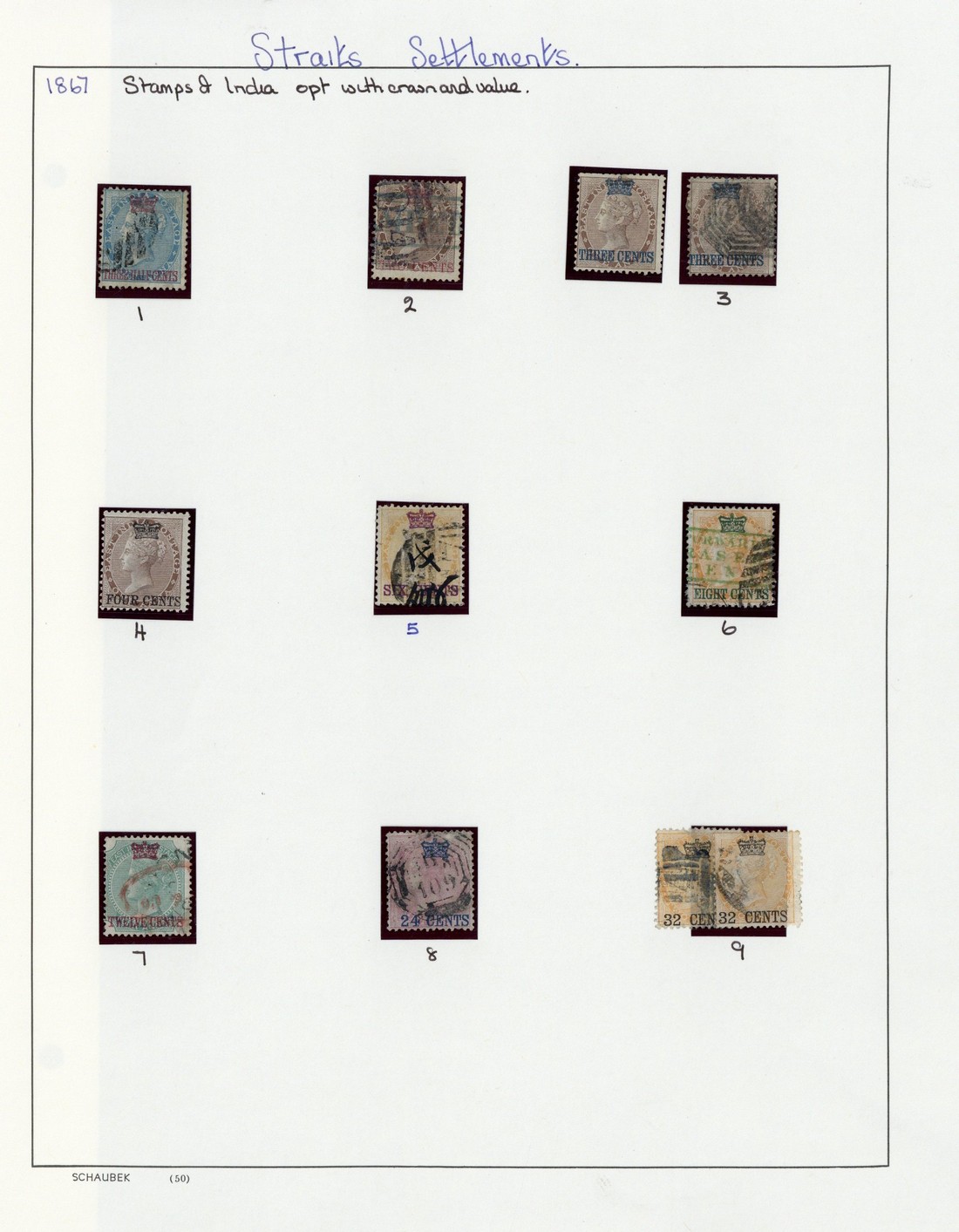 1867 (Sept.) on India 1½c. on ½a., 2c. on 1a., 3c. on 1a., 6c. on 2a., 8c. on 2a., 12c. on 4a., 24c. on 8a. and 32c. on 2a. (2), all used, the 24c. cancelled "B/109", some of the others additionally with firm's chop or manuscript, also unused 3c. on 1a. and 4c. on 1a.; condition mixed