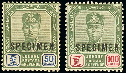 1922 $50 green and ultramarine, (tiny thin-spot) and $100 green and scarlet, both overprinted "specimen", fine mint. S.G. 126s-127s, £600. Photo