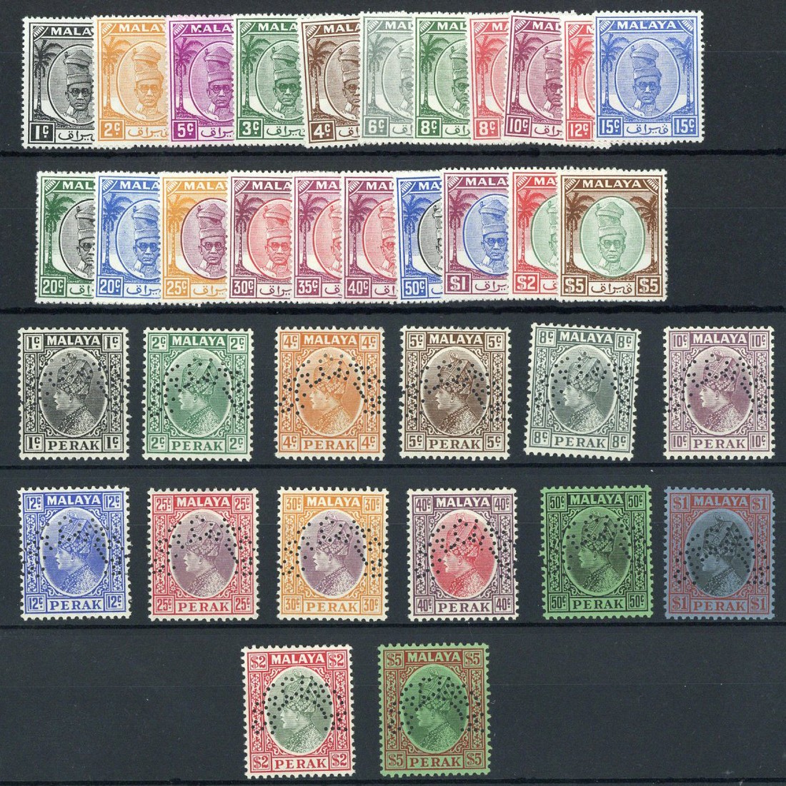 1935-37 1c. to $5 less 6c., each perforated "specimen", 1950-56 1c. to $5 with large part original gum or unmounted mint, fresh and fine. S.G. 88s-102s, 128-148