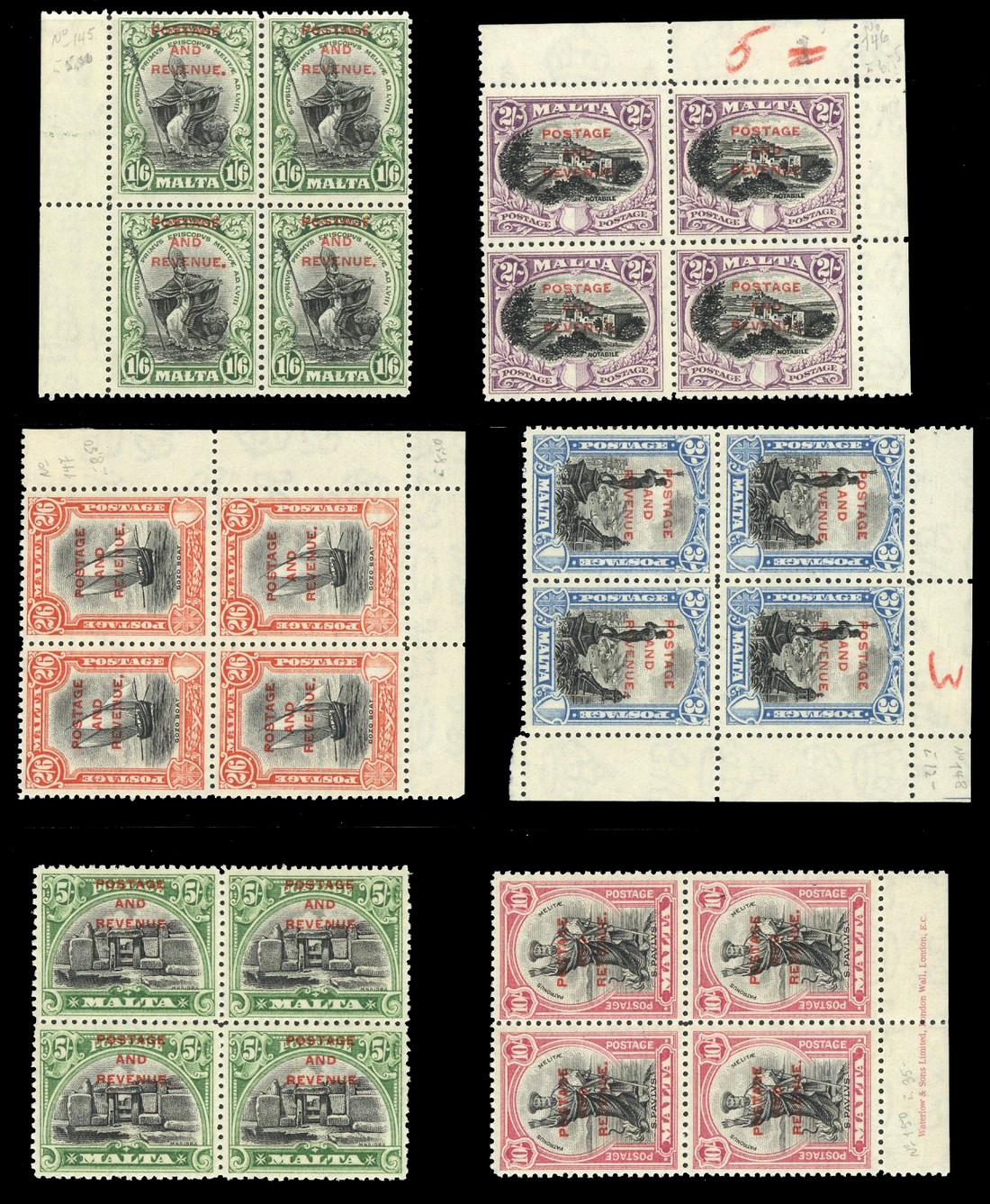 1928 (Oct.-Dec.) ¼d. to 10/- set of seventeen in blocks of four, the 10/- with imprint, fine mint. S.G. 174-192, £800