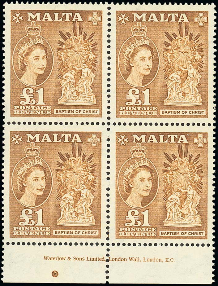 1956-58 ¼d. to £1 set of seventeen in marginal blocks of four, some with imprint, fine unmounted mint. S.G. 266-282. Photo for £1