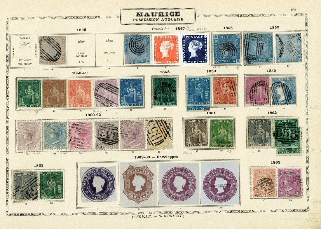 1848-1900 collection on pages from an old "Maury" album plus on stockcards, including 1848 Post Paid worn impression 1d. used, Lapirot 1859 2d. used (4), 1859 Britannia 9d. magenta used, Dardenne 2d. used, 1862 1/- deep green used (2), 1878 surcharged set of nine mint, thereafter later issues to 1899 together with 1900 1r. and 5r. mint, 1910 10r. mint plus some postal stationery cut-outs. Also some Seychelles. Condition variable though a good lot