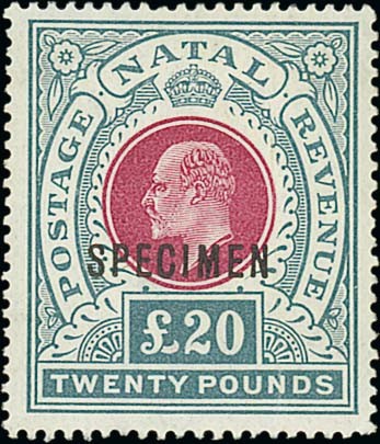 1902 £1.10, £5, £10 and £20, each overprinted "specimen", without gum, vertical creases on £5 and £20, otherwise fine. S.G. 143s-145bs, £1,235. Photo