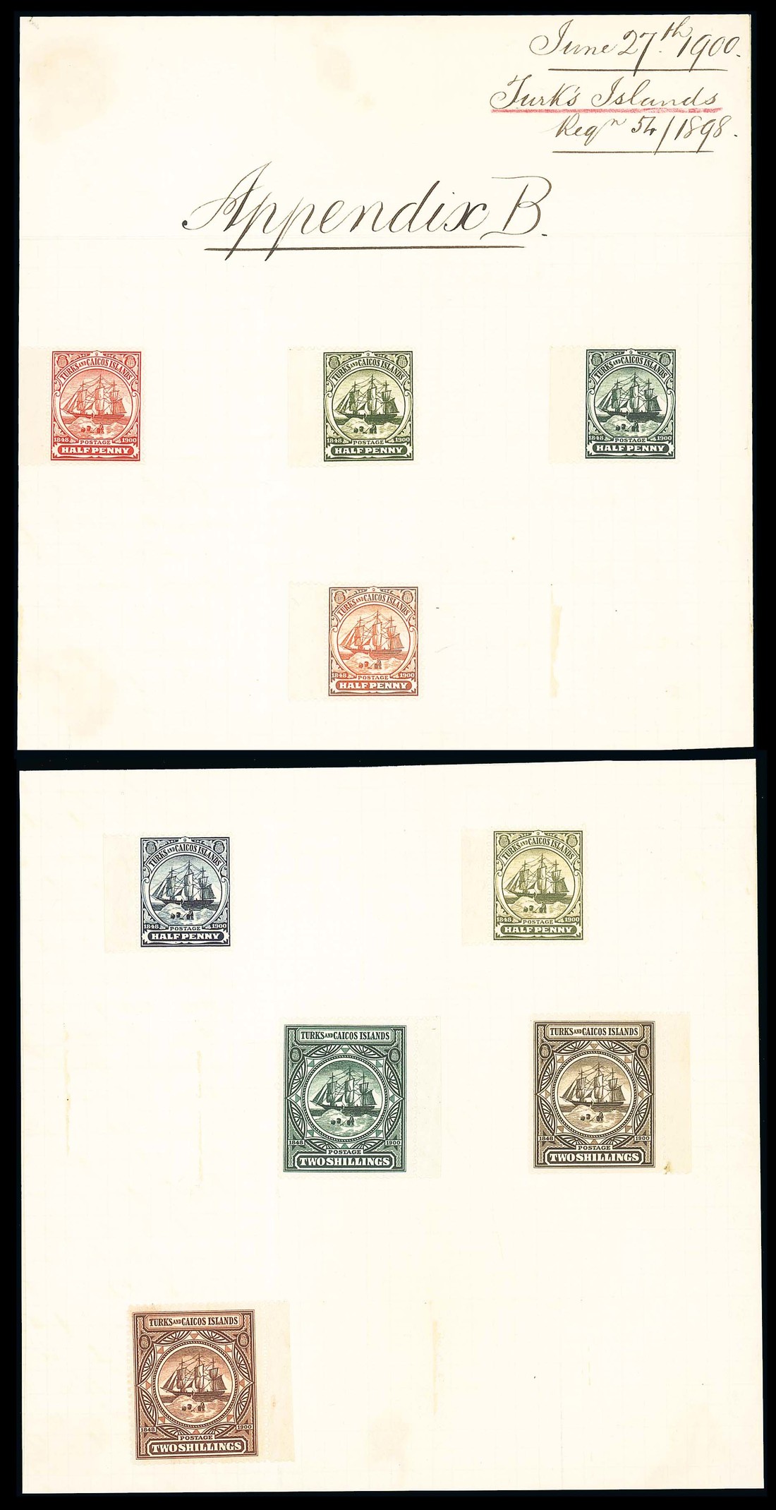 "Appendix B" sheet (152x304mm., divided into two parts to fit album pages) dated "June 27th 1900", bearing six ½d. and three 2/- marginal colour trials in alternative colours; a few perforations slightly trimmed, a vertical crease crosses the margin of one trial. Photo