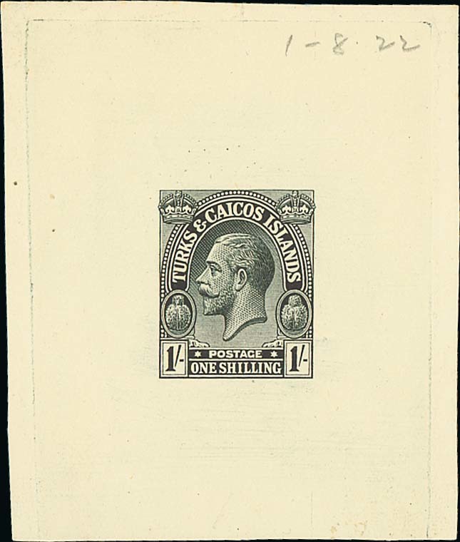 1/- in black on die sunk wove paper (approx. 55x65mm.) dated "1-8-22" in pencil, fine. Photo