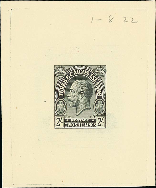2/- in black on die sunk wove paper (approx. 55x65mm.) dated "1-8-22" in pencil, fine. Photo