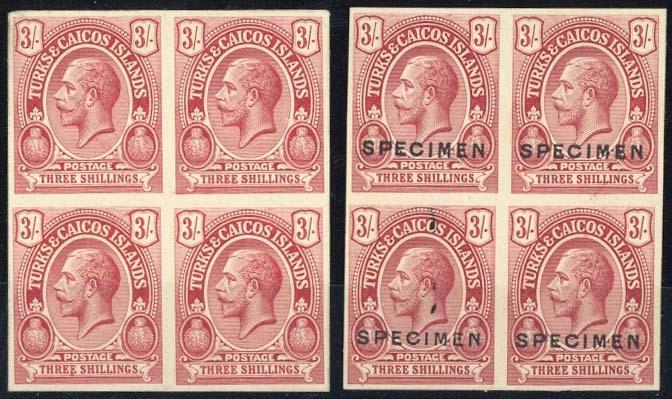 1913 3/- in carmine, two imperforate blocks of four, one overprinted "specimen" (DS1)