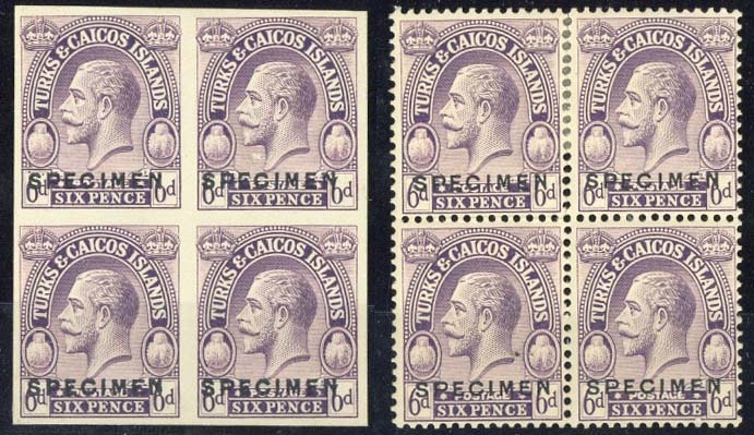 1922 6d. in grey-purple, two blocks of four, one imperforate, each overprinted "specimen" (DS1)