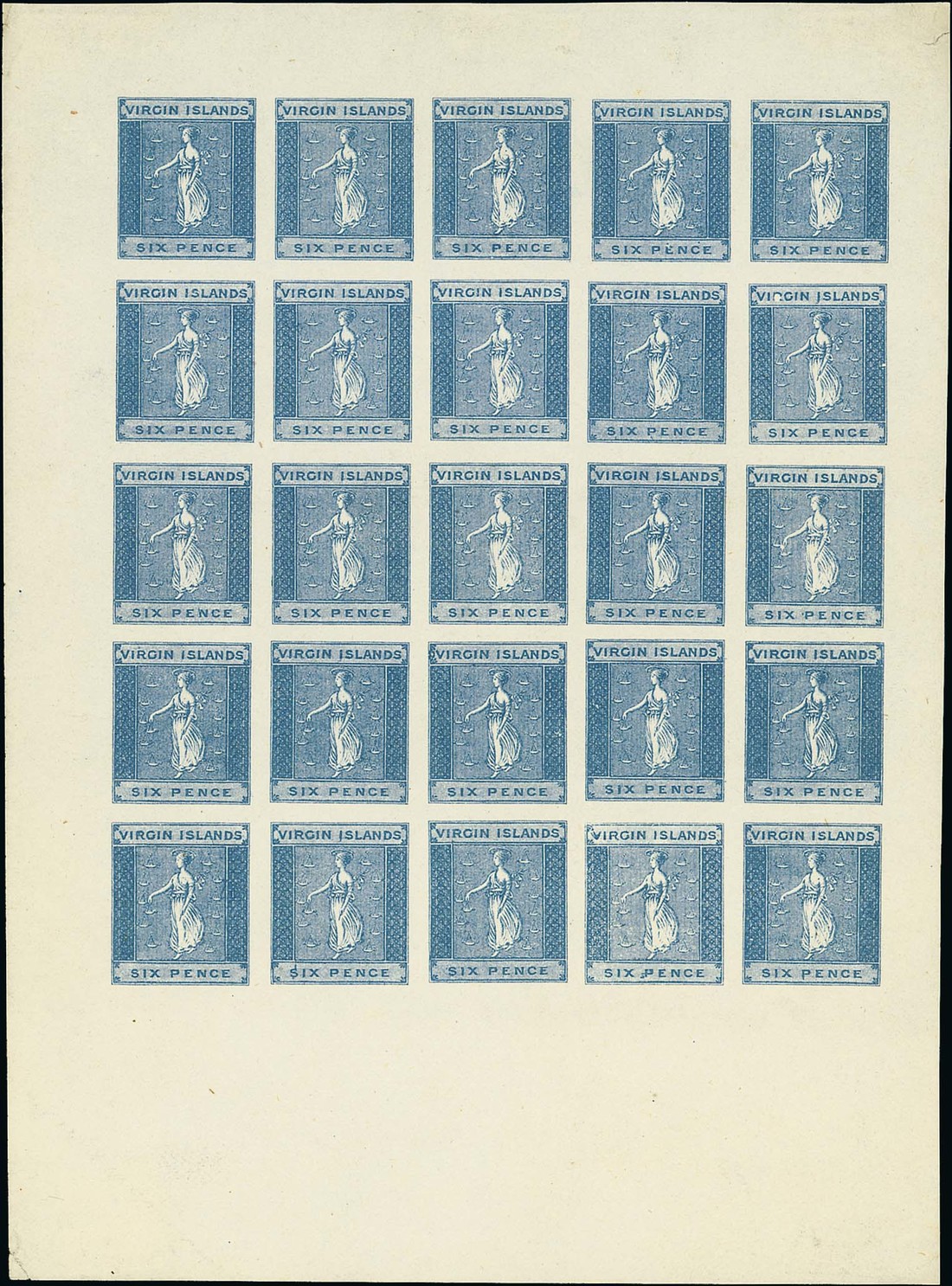 6d. blue complete sheet of twenty-five (5x5) from an unissued transfer, large surrounding margins (127x173mm.). Photo