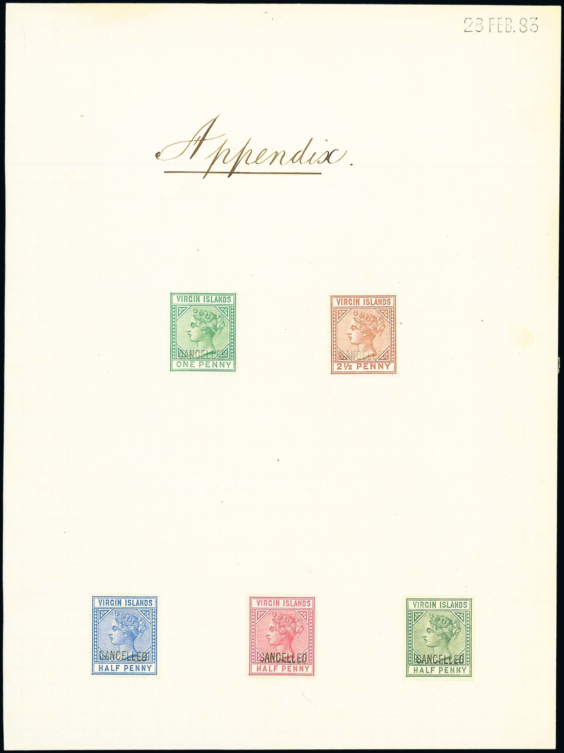 1883 (28 Feb.) "Appendix" sheet bearing ½d. (3) in blue, in red and in green, together with 1879-80 CC 1d. and 2½d., each handstamped "cancelled" (D7). Photo