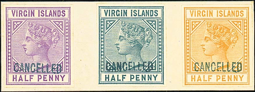 1883 (12 Mar.) card (75x28mm.) bearing ½d. (3) in purple, in slate and in yellow-orange, each handstamped "cancelled" (D7); the date in manuscript on reverse. A beautiful trio. Photo