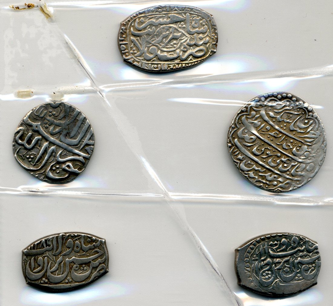 Safavid, Sultan Husayn I, rectangular 5-Shahis (3), Eravan, AH1124, 1128, Tabriz, AH1129, Tahmasp II (1722-32), Abbasi, Mashhad, AH1143, Hotaki Dynasty, Ashraf (1725-29), Abbasi, Qazvin (KM.276.1, A276.1, A276.3, 303.8, 338.2), very fine (5)