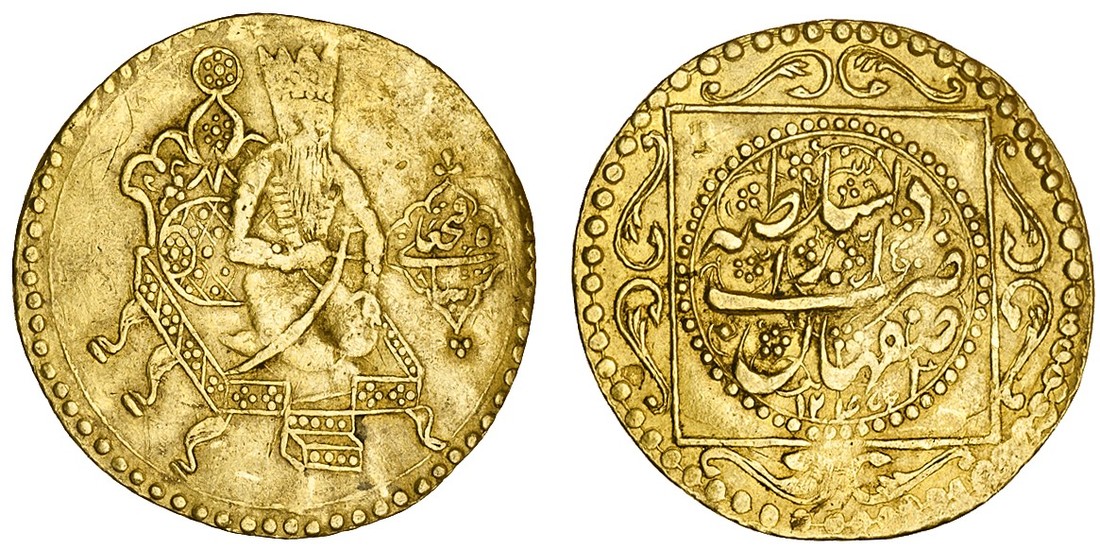 Qajar, Fath 'Ali Shah, AV portrait Ashrafi, 3.41g, Dar al-Sultanat Isfahan, AH1245 / 6, Shah seated on throne three-quarters right, name in cartouche in right field (obverse as KM.763, reverse as KM.764), very fine, rare