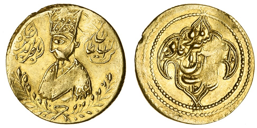 Qajar, Nasir al-din Shah (1848-96), AV portrait Toman, 3.45g, Dar al-Mu'minin Astarabad, AH12(79), crowned bust of Shah left (KM.861.1), good very fine