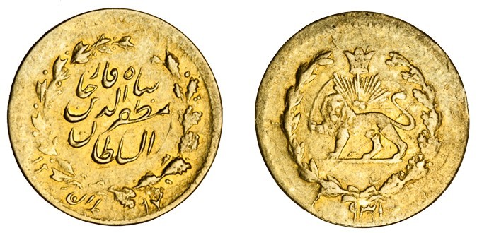 Qajar, Muzaffar al-din Shah (1897-1907), AV 2000-Dinars (1/5-Toman), 0.61g, Tehran, AH1297 below legend, rev. lion standing left with crown above, error date '931' for AH1319 below (KM.986), very fine, scarce