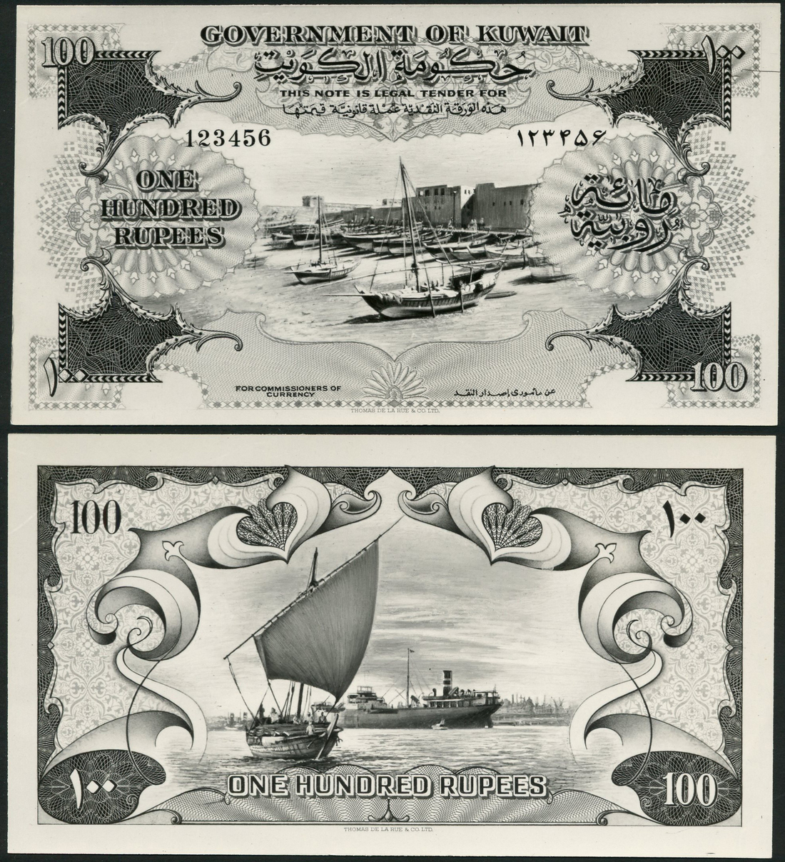 (†) Government of Kuwait, an archival photograph for the obverse and reverse of a proposed issue of 100 rupees, ND (1953), serial number 123456, black and white, boats on a beach at centre, reverse boat and ship at centre