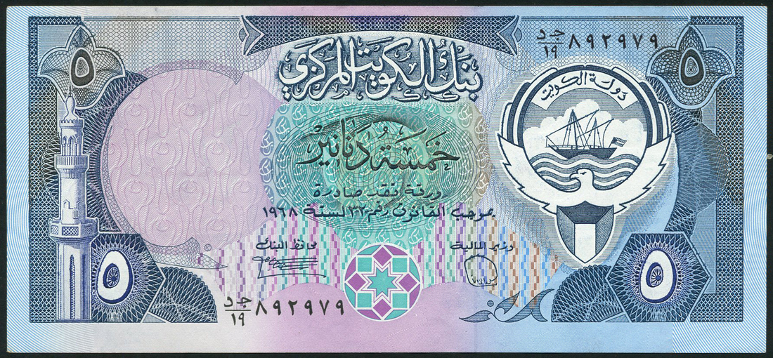 (x) Central Bank of Kuwait, 5 dinars, law of 1968 (1980-91), serial number 892979, deep blue and black on multicolour, minaret at left, arms at right, reverse the Seif Palace, watermark dhow