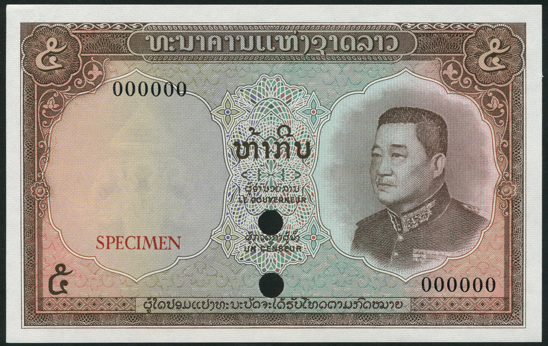 (†) Banque Nationale du Laos, specimen 5 kip, ND (1962), zero serial numbers, brown, S.Vong at right, also specimen 1 kip, ND (1962), blue and lilac, also specimen 10 kip, serial number A1 000000, red, ND (1974), King Savang Vatthana at right centre