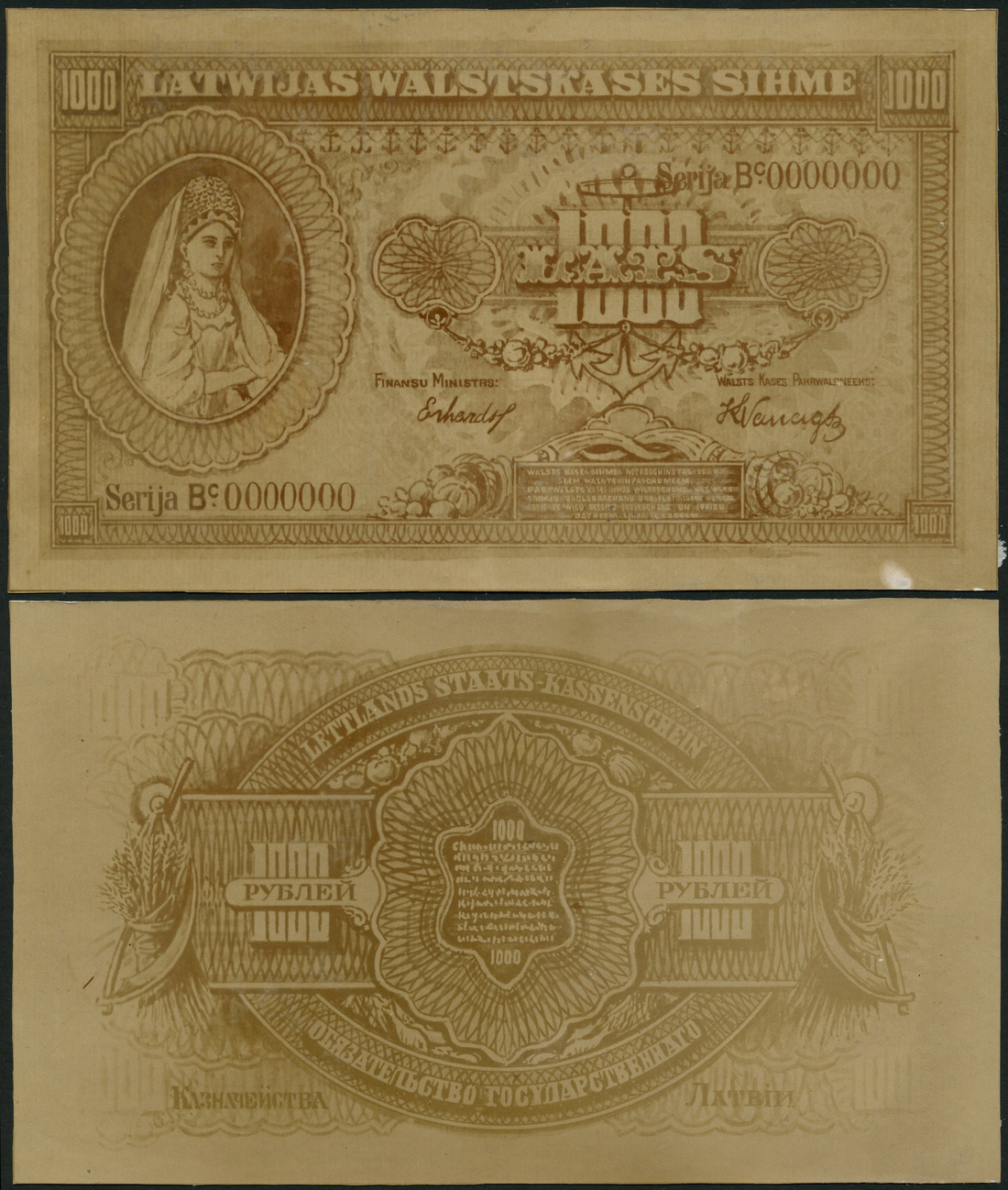 Latvian Government, obverse and reverse archival photograph of a design for a 1000 lats, ND (c.1920), woman in traditional dress at left, value at centre right and each corner, reverse value at left and right, flanked by scythes and wheat sheaves