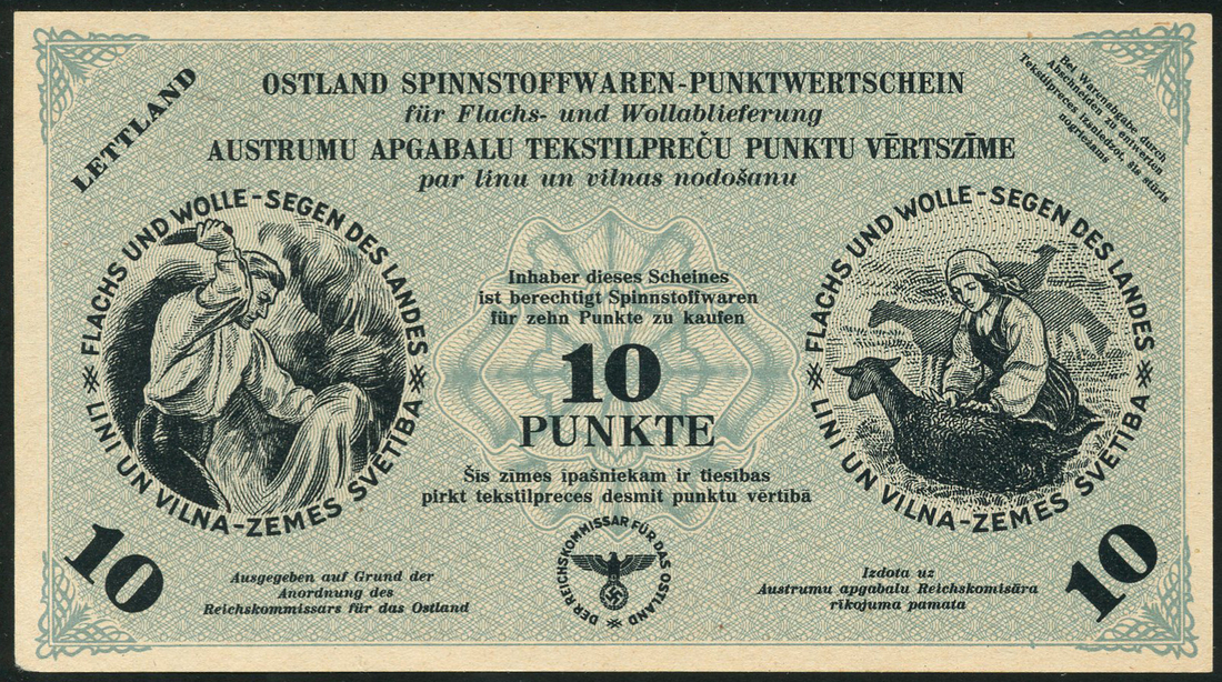 German Occupation Point Token, Latvia, 10 punkte, 30 April 1945, green and black, man in circular frame at left, woman shearing sheep at right, reverse, black text