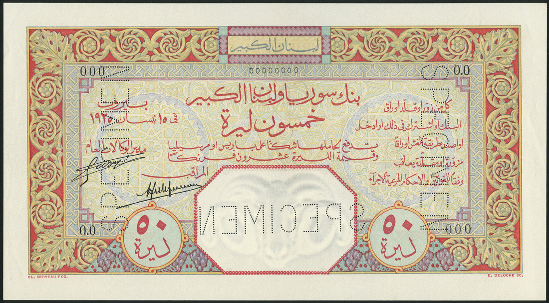 (x) Banque de Syrie et du Grand-Liban, Lebanon, specimen 50 livres, 15 April 1925, zero serial numbers, red and multicoloured, value in red low left and right, Forges and Laferriere signatures, reverse blue and multicoloured, house at centre, value in red top right centre and at each corner, blue GRAND-LIBAN top centre
