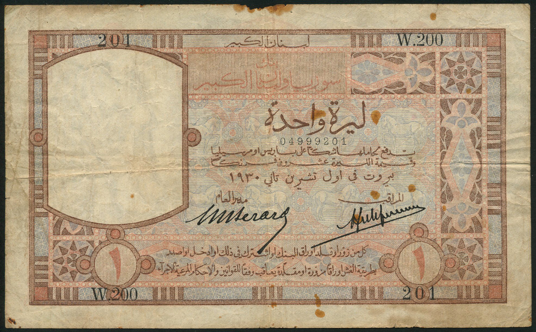 Banque de Syrie et du Grand-Liban, Lebanon, 1 livre, 1930, serial number W.200 201, brown, red and blue, value at low left and right, Berard and Laferriere signatures, reverse multicolour, coastal view at centre and left, GRAND-LIBAN in blue top centre
