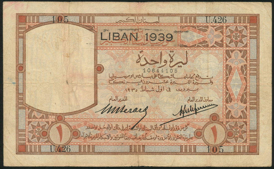 (x) Banque de Syrie et du Grand-Liban, Lebanon, 1 livre, 1939 (old date 1935), serial number U.426 105, multicolour, ornate border, value low left and right, black LIBAN 1939 overprint top centre, Berard and Laferriere signatures, reverse, blue and reddish brown, harbour and mountains in background, GRAND-LIBAN in blue top centre