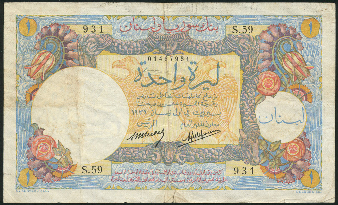 Banque de Syrie et du Liban, Lebanon, 1 livre, 1939, prefix S.39, pale blue and multicoloured, eagles at centre, ornate background detail, Berard and Laferriere signatures, reverse multicoloured, cedar tree at centre, red LIBAN top centre