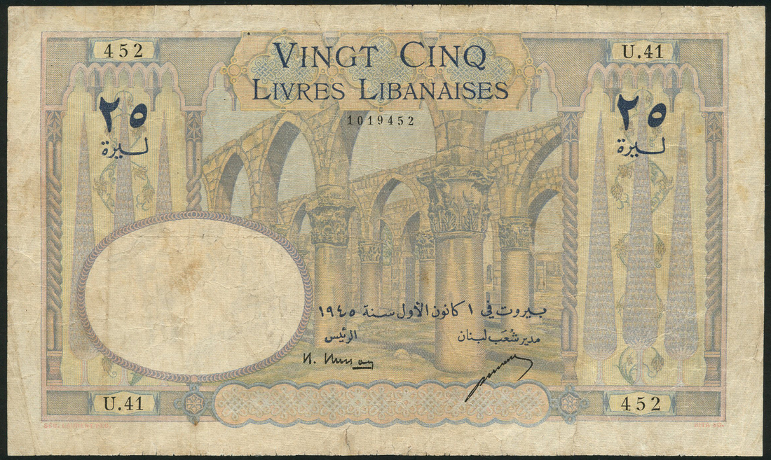 (x) Banque de Syrie et du Liban, Lebanon, 25 livres, 1 December 1945, serial number U.41 452, multicolour, Corinthian columns, Busson and Letayf signatures, value in blue top left and right, reverse, frieze with lion's head at centre, ornate border