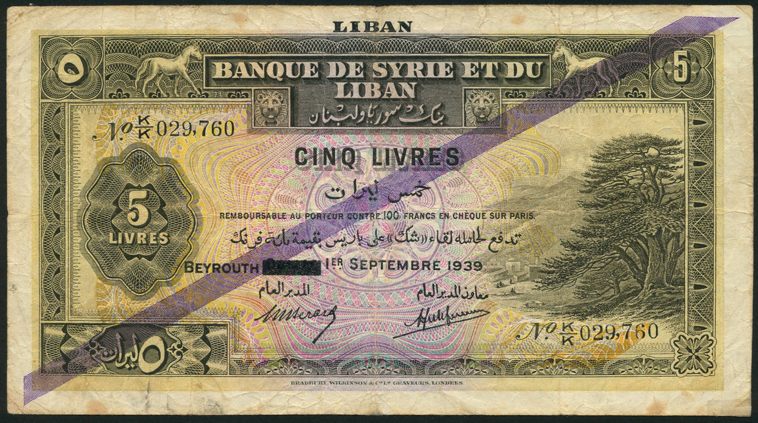 Banque de Syrie et du Liban, Lebanon, 5 livres, 1st September 1939, prefix K/K, black, lilac & orange, cedar trees at right, violet diagonal overprint on face of note, LIBAN top centre, Berard & Laferriere signatures, reverse brown & multicoloured, the Port of Beirut at centre, violet diagonal overprint across face