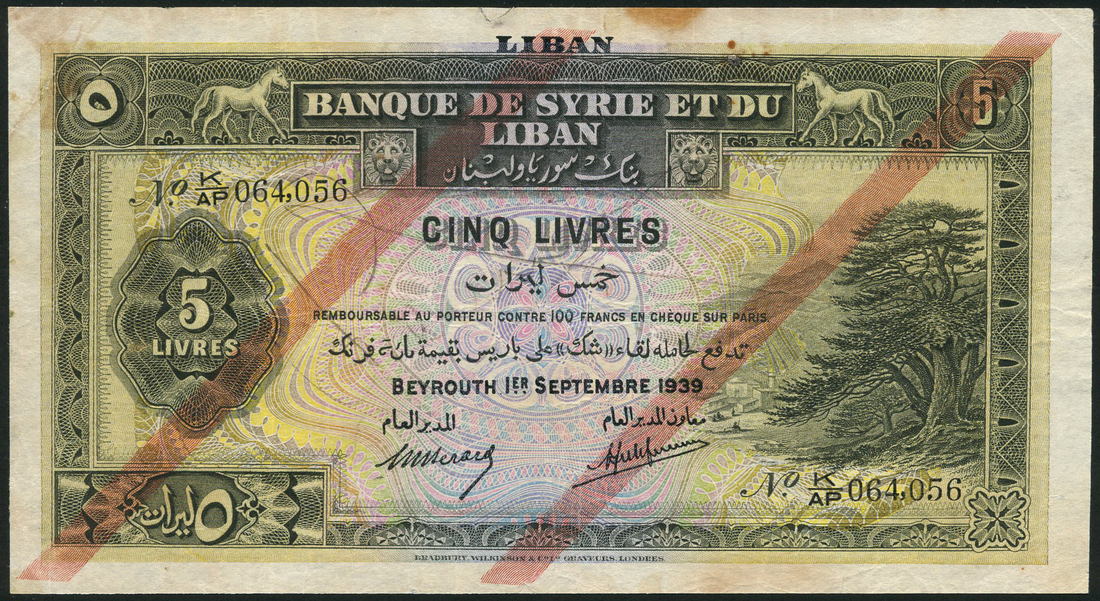 Banque de Syrie et du Liban, Lebanon, 5 livres, 1st September 1939, prefix K/AP, black, lilac & orange, cedar trees at right, two diagonal red lines across face, LIBAN top centre, Berard & Laferriere signatures, reverse brown & multicoloured, Port of Beirut at centre, two diagonal red lines across face