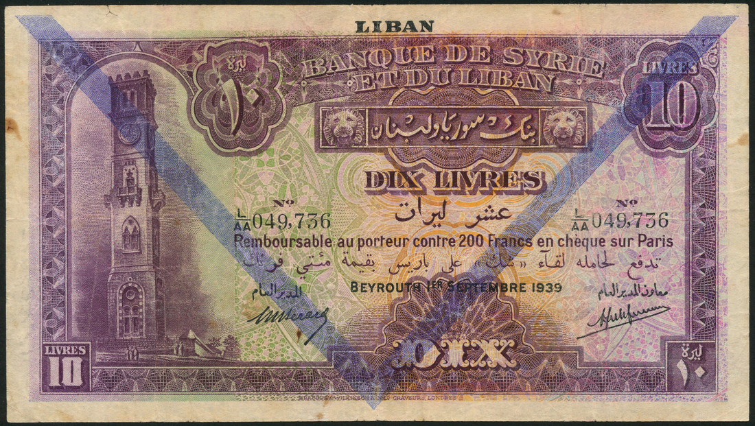 (x) Banque de Syrie et du Liban, Lebanon, 10 livres, 1 September 1939, serial number L/AA 049,736, purple on multicolour, clock tower at left, black LIBAN overprint top centre, blue chevron in field, Berard and Laferriere signatures, reverse, magenta and multicolour, river scene