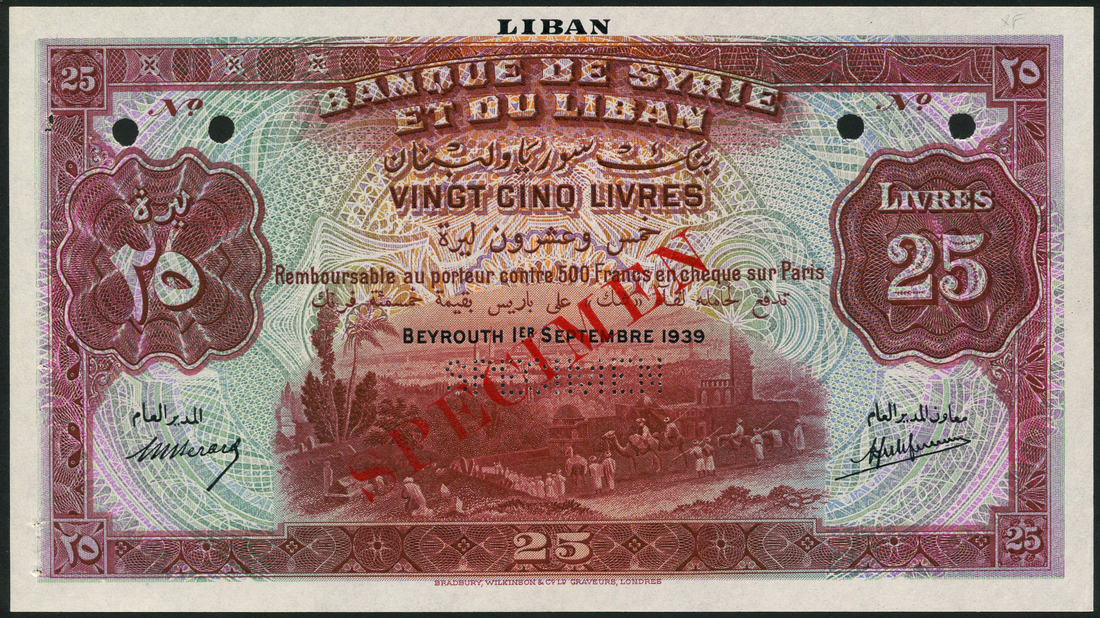 Banque de Syrie et du Liban, Lebanon, specimen 25 livres, 1st September 1939, brown-purple & pale blue, green & lilac, camel train by cemetery and the Mausoleum of Zeinab at centre, value at left and right, Berard & Laferriere signatures, LIBAN top centre, reverse green & multicoloured, well at centre, value at left and right
