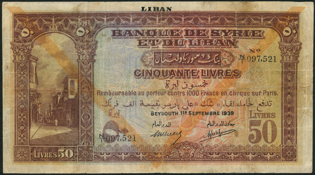Banque de Syrie et du Liban, Lebanon, 50 livres, 1st September 1939, serial number N/I 097521, brown & multicoloured, Syria street at left, orange chevron at centre, Berard & Laferriere signatures, LIBAN top centre, reverse blue, feluccas and a hillside in Syria, orange chevron at centre
