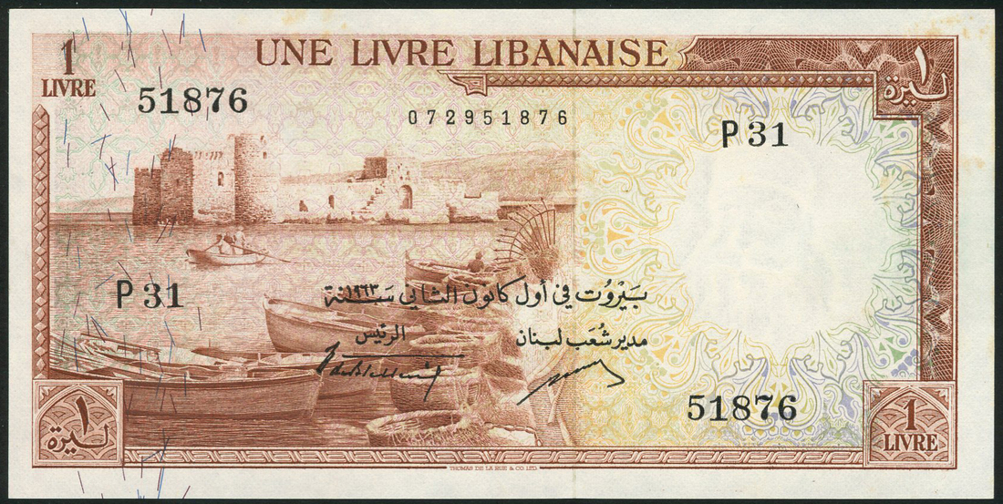Banque du Syrie et du Liban, Lebanon, 1 livre, 1963, serial number P31 51876, brown on multicolour underprint, Castle at Sidon at left, also Republique Libanaise, 5 piastres, 12 January 1948, serial number D.734029, blue and yellow