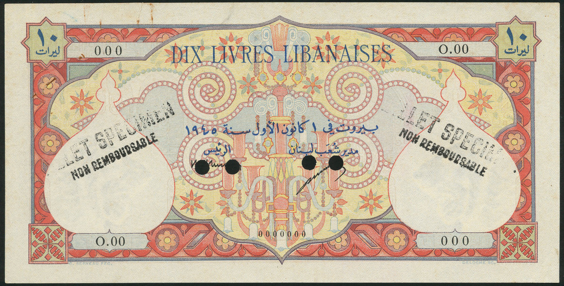 Banque de Syrie et du Liban, Lebanon, specimen 10 livres, 1945, zero serial numbers, red and multicoloured, chandelier and ornate background detail, Berard and Laferriere signatures, reverse red and multicoloured, courtyard at right