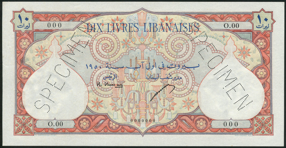 (x) Banque de Syrie et du Liban, Lebanon, specimen 10 livres, 1950, zero serial number, red and multicoloured, geometrical patterns in field, chandelier at centre (from El Adm Palace in Damascus), value top left and right, reverse, multicoloured, the courtyard of Neiteddin Palace at centre, value top left and right